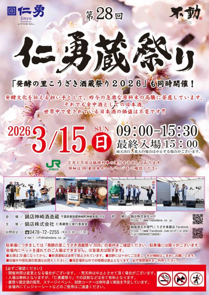 来たる3月15日(日)は第28回仁勇蔵祭りが開催されます。また、神崎町全体で繰り広げられる「発酵の里こうざき酒蔵祭り」も同時開催となります。今年度も神崎町には5万人を超えるお客様が来場されると見込まれておりますが、鍋店としても万全の準備をして、皆様に喜ばれる祭りをお届けしたいと考えております。昨年の第27回仁勇蔵祭りでは有料試飲リストの製品が早い時間に品切れをしてしまい、多くの皆様に不快な思いをさせてしまった大きな反省点が御座いましたが、今年は充分に製品を準備いたしますので、どうかご安心下さい。但し、令和7BYの酒造りでは原料米の大幅高騰の影響を真面に受けて、限定酒をはじめとしてご提供価格が上がってしまいましたが、何卒、ご理解とご了承を賜りたく宜しくお願申し上げます。3月15日(日)にはどうかお誘い合わせの上、鍋店神崎酒造蔵へお越しください。