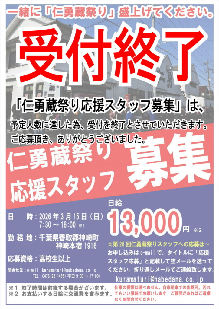 第28回仁勇蔵祭り(2026年3月15日開催)にて広く募集をしておりました「応援スタッフ」につきましては、お陰様で定員に達しましたので受付を終了させて頂きます。多くの皆様よりお声がけを頂きましたことを心より御礼申し上げます。本当にありがとう御座いました。