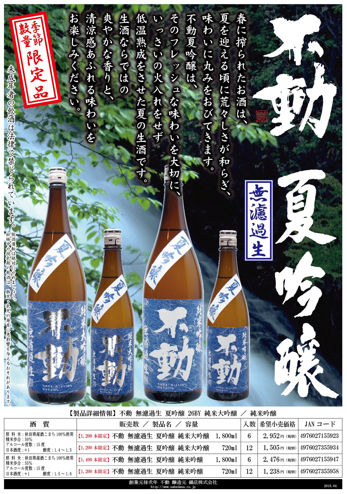 不動シリーズ、夏季製品として毎年大変ご好評を頂戴しております『不動 夏吟醸』