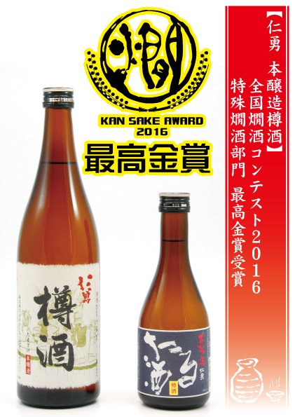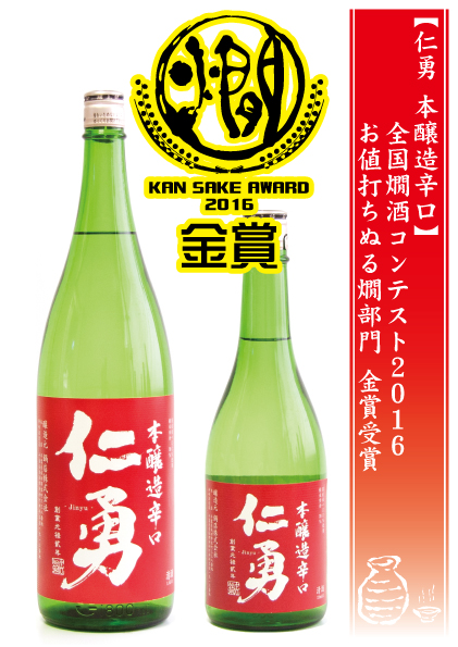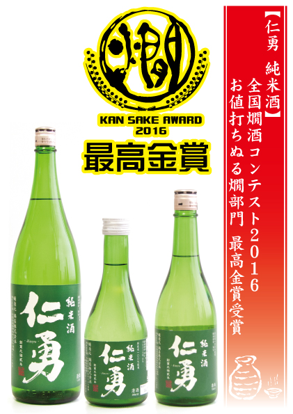 平素は格別のご愛顧を賜り、厚く御礼申し上げます。 このたび「全国燗酒コンテスト2016(主催:全国燗酒コンテスト実行委員会 後援:日本酒造組合中央会)」において 仁勇 純米酒がお値打ちぬる燗部門 最高金賞受賞 仁勇 本醸造辛口が同部門 金賞受賞 仁勇 本醸造樽酒が特殊燗酒部門 最高金賞受賞致しました。