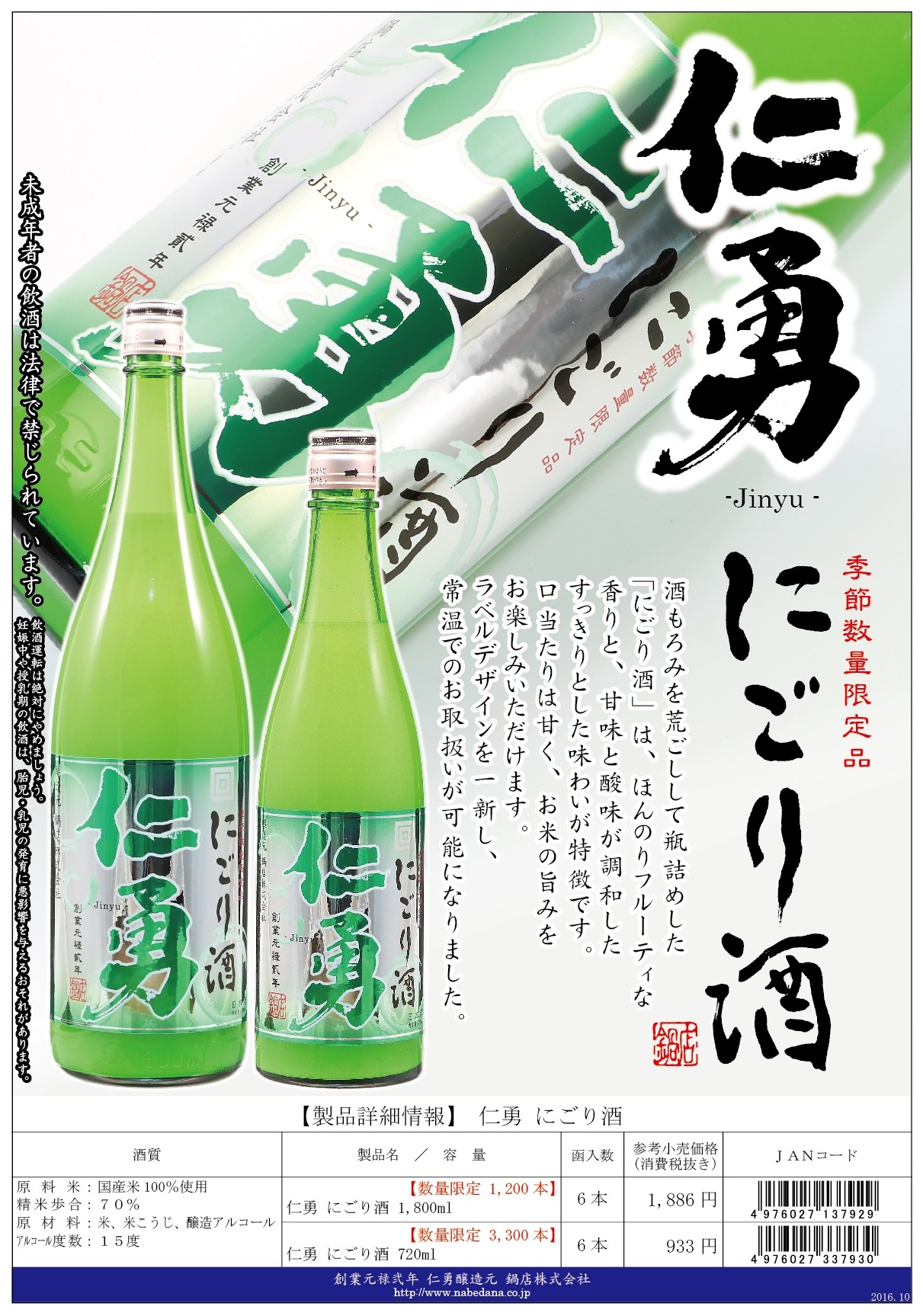 仁勇 にごり酒 1,800ml 小売価格 1,886円 仁勇 にごり酒 720ml 小売価格 933円