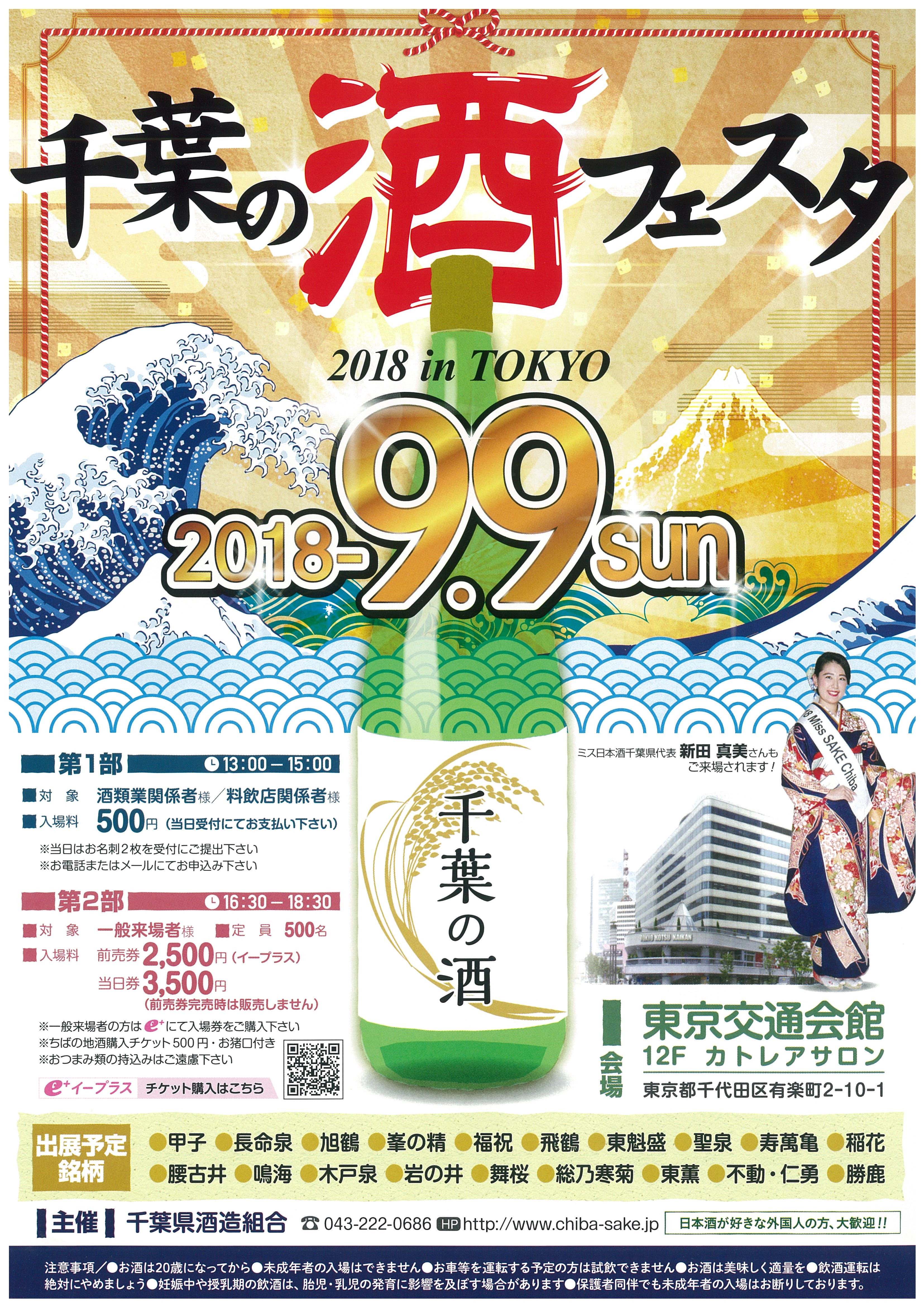 平素は格別のお引き立てを賜り、ありがたく厚く御礼申し上げます。 昨年より有楽町で開催しております「千葉の酒フェスタ」ですが、今年も東京交通会館 で開催いたします。 当日は、千葉県の蔵元19社の試飲をお楽しみいただけます。 また、日本酒が大好きな海外の方の参加大歓迎です。 是非、皆さんお誘い合せの上、ご来場ください。 開催日 2018年9月月9日(日) 会 場 東京交通会館12F カトレアサロン 時 間 第1部 13時00分〜15時00分※ 第2部 16時30分〜18時30分 ※第一部は業界関係者のみのご入場となり、メール又は電話での事前申し込みが必 要となります。 入場料 第1部 500円 第2部 前売券 2,500円(eプラスにて7月5日より販売) 当日券 3,500円(当日会場にて販売) 第二部の特典 @地酒購入チケット 500円付き Aミニきき猪口付き 詳しくは、千葉県酒造組合のホームページにてご確認ください。 http://www.chiba-sake.jp/