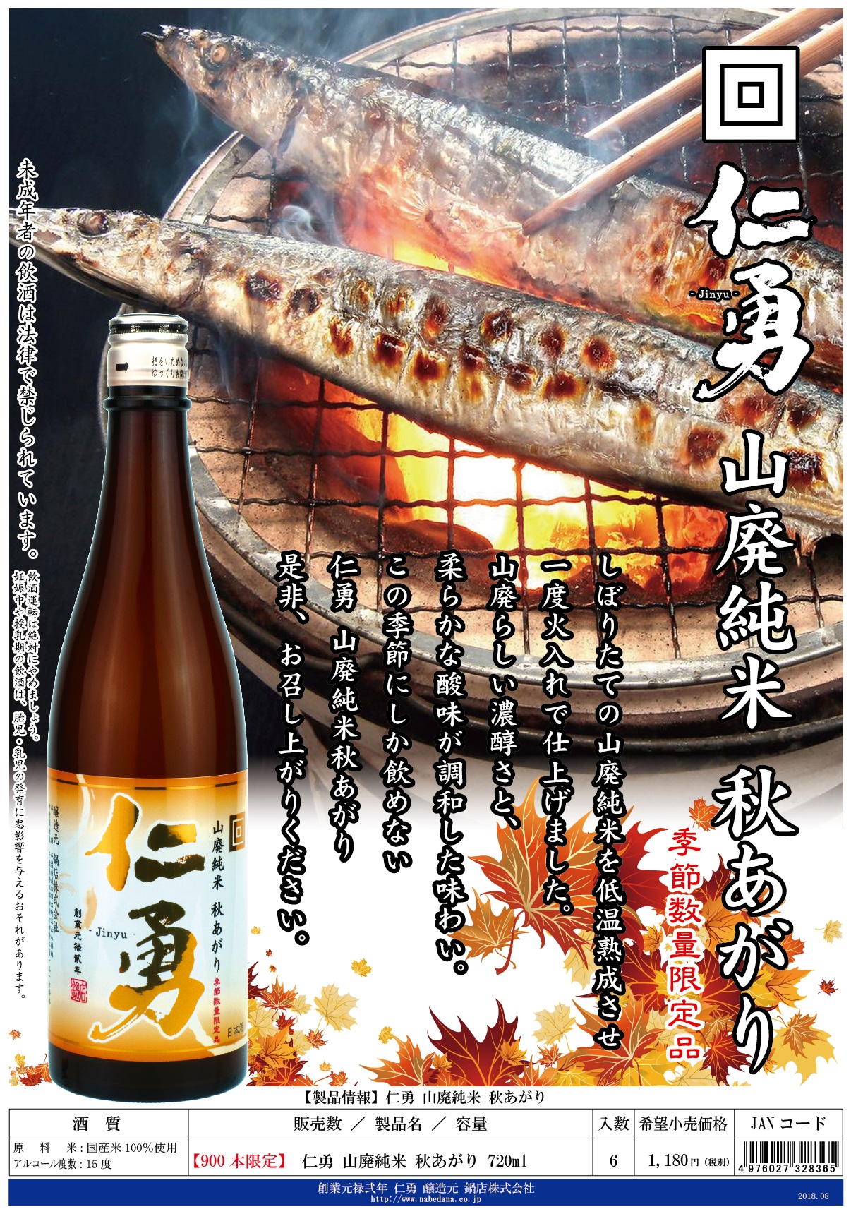 仁勇 山廃純米 秋あがり 720ml 小売価格 1,200円 900本 限定販売