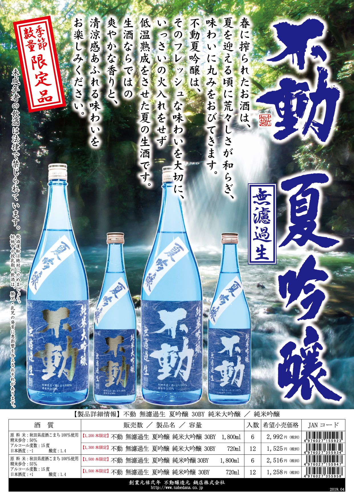 不動シリーズ、夏季製品として毎年大変ご好評を頂戴しております『不動 夏吟醸』