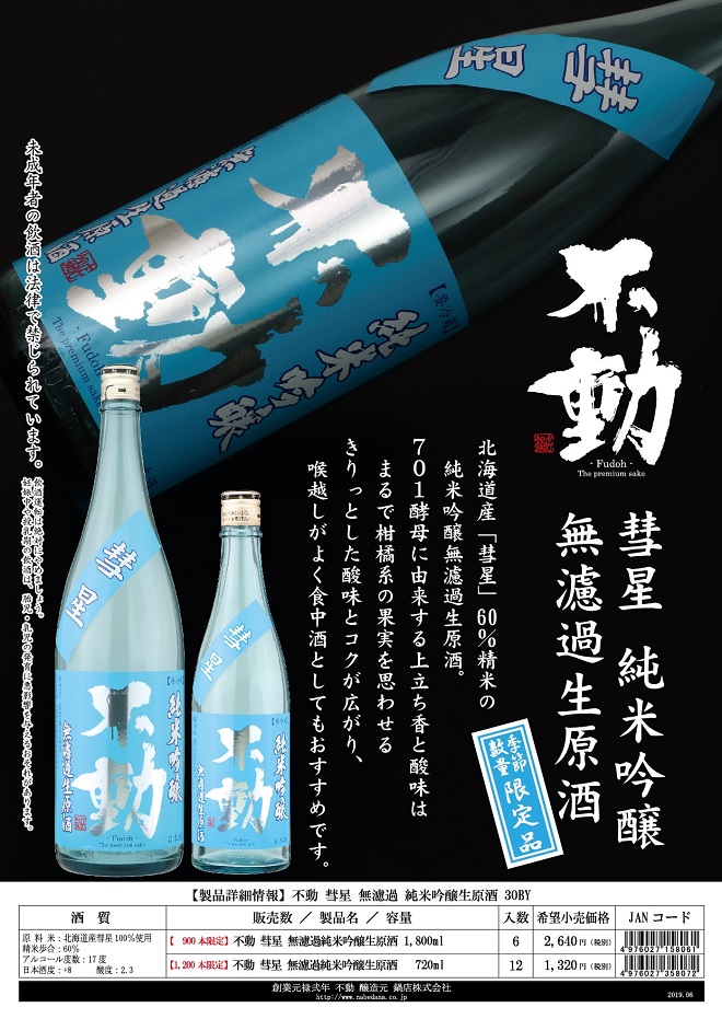 不動シリーズ、夏季製品として毎年ご好評を頂戴しております『不動 彗星 純米吟醸 無濾過 生原酒』
