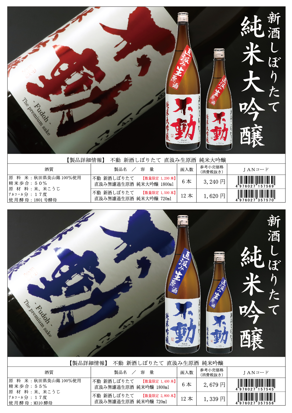 直汲み 無濾過生原酒 純米大吟醸 1800ml 小売価格 3,240円 (限定 1,200本) / 720ml 1,620円 (限定 1,500本) 直汲み 無濾過生原酒 純米吟醸 1800ml 小売価格 2,679円 (限定 1,400本) / 720ml 1,339円 (限定 2,400本) 記載した小売価格は、税別 ご予約・お買求めは最寄りの不動特約店までお願いいたします。