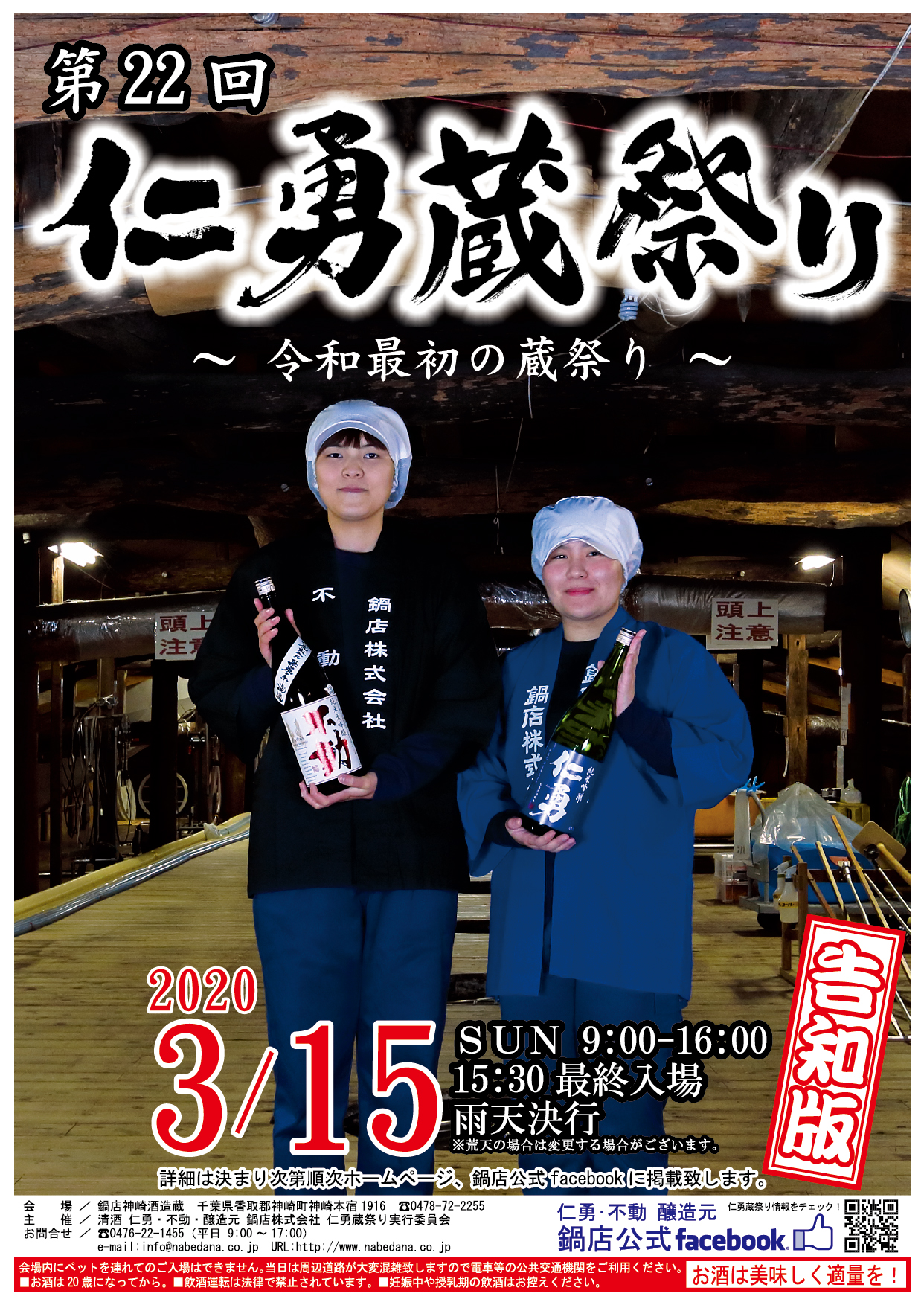 2020年3月15日(日)に「第22仁勇蔵祭り」を開催致します。 開催日時:2020年 3月15日(日) 9:00〜16:00迄(最終入場15:30) 場 所:鍋店神崎酒造蔵 千葉県香取郡神崎町神崎本宿1916 地図 |