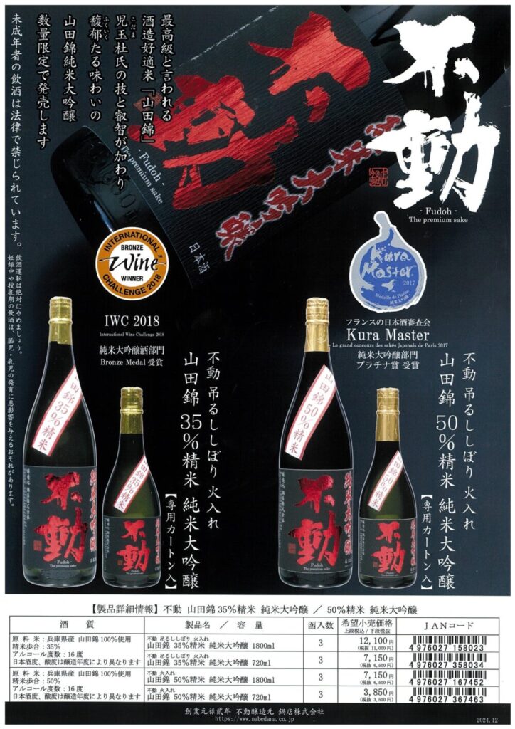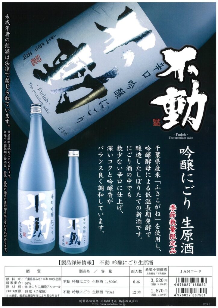 不動シリーズの冬アイテム「辛口吟醸にごり生原酒」2アイテムと不動・山田錦シリーズを出荷開始致します。吟醸にごり生原酒は日本酒度+11の辛口タイプで、冬の寒い時期に食べたい鍋料理にも相性の良い万能な食中酒です。また山田錦は精米歩合35%と50%の二つのタイプの純米大吟醸。冬のご贈答品としても最適な製品です。どちらも極少量の限定品ですので、是非お早めに不動特約店会・加盟店にてお買い求め下さい。