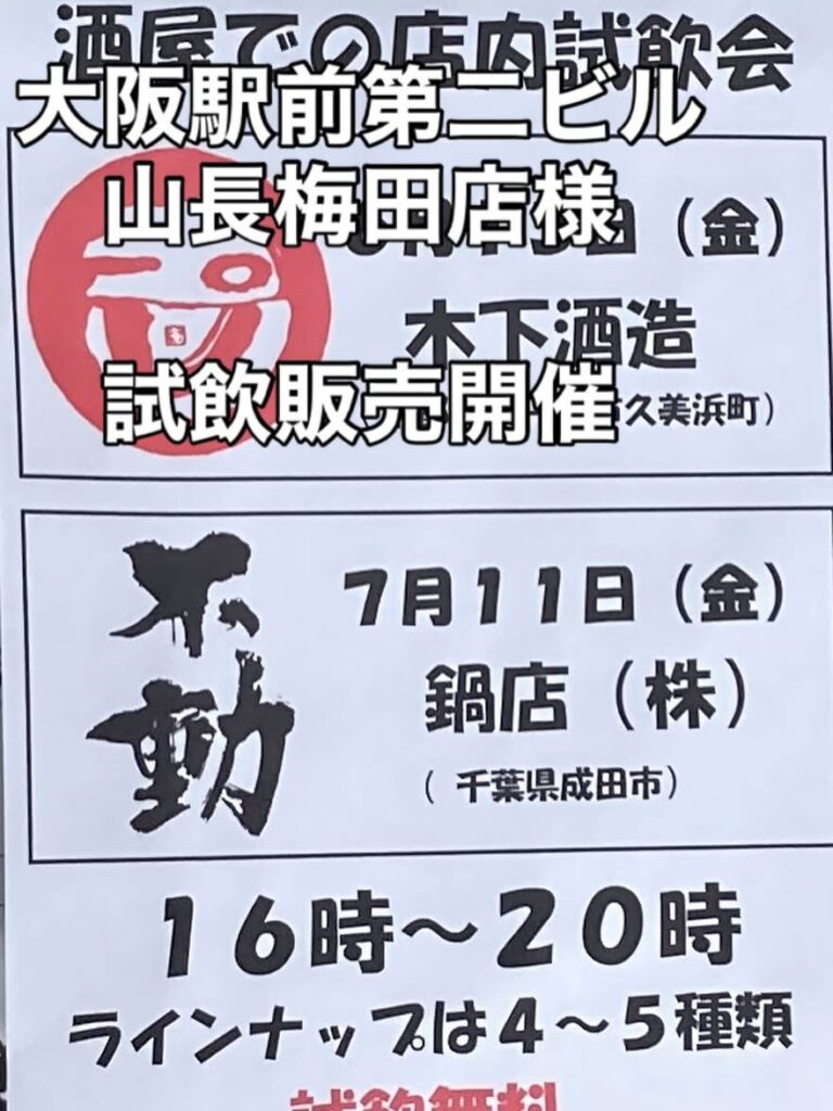 • 令和7年7月11日(金)16:00~20:00に大阪駅前第二ビル・山長梅田店様に於いて不動シリーズ4~5アイテムの試飲会を実施します。弊社・営業部長の清水が担当致しますので、どうかお近くのお客様はこの機会に不動の酒質をお確かめ頂ければ幸いです。宜しくお願い致します。