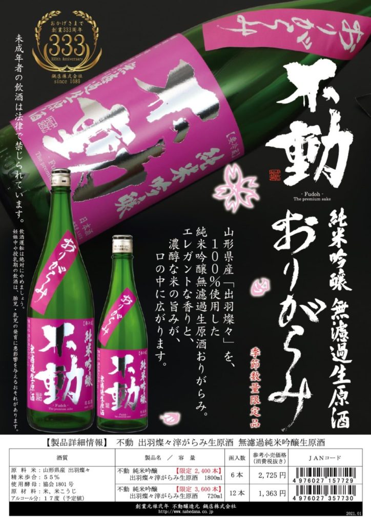 毎年2月に発売し大変ご好評を頂戴しております「不動 出羽燦々滓がらみ 純米吟醸 無濾過生原酒」を2月9日(火)より出荷開始いたします。